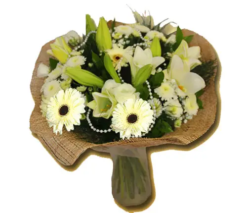 זר פרחים לבנים מדהים ביופיו, בצבע של פנינה.