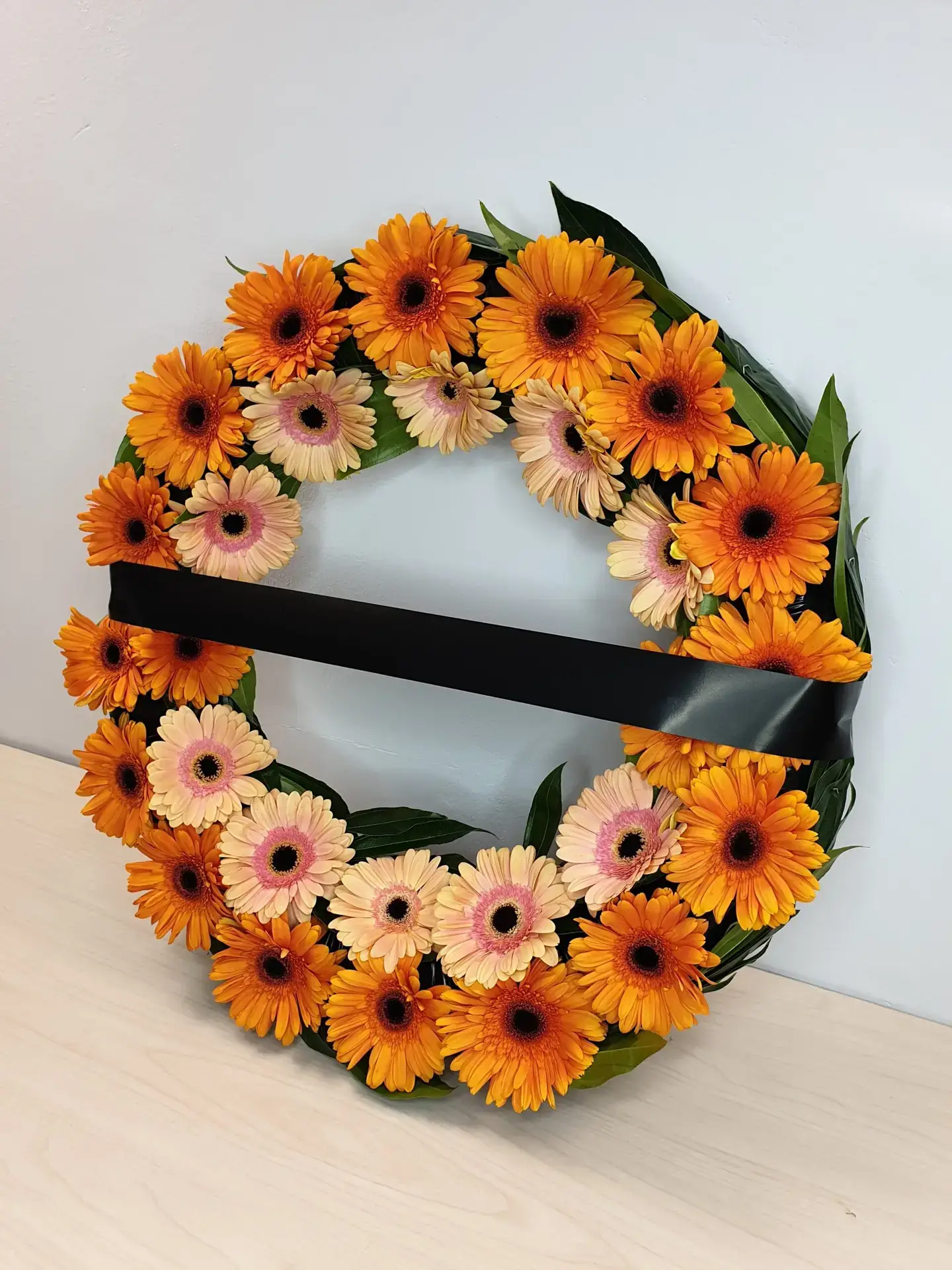 גלגל אבל 2 שורות פרחי גרברות וחרציות עם מעטפת עלים ירוקים.